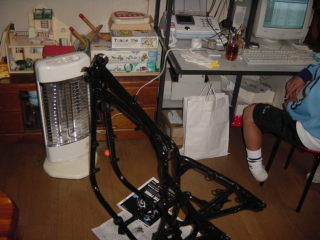 日曜日にフレームを塗装してから、フレームは我が家のリビングルームに鎮座しており、昨日の夜に見てみましたが、塗膜の厚い部分はまだ硬化していませんでした。そこで今日から遠赤外線ヒーターを持ち出して加熱してみました。