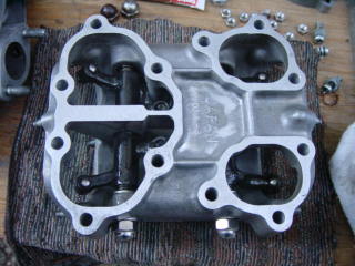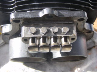 そしてロッカーカバーにロッカーアームとシャフトを組み付けていきます。ロッカーアームは吸気、排気側で形状が違いますが、どちらか忘れてしまったので、適当に組み付けたら、見事に逆でした。正しい組み合わせにしたのが、下の写真です。袋ナットはW1クレージーズで譲ってもらったステンレス袋ナットですが、これは特別な形状、寸法ではなく、規格品で間に合うようです。