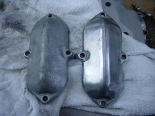 続いてロッカーカバーを磨いてみました。電ドルに円形の真鍮ブラシを付け、表面を汚れを落とし、次にバフ布に取り替え、青棒で研磨していきます。下の写真の左側が研磨前、右が研磨後です。そして前後とも磨き終わりました。