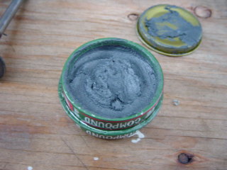 バルブコンパウンドは黒に近い灰色で、あとで使ってみた結果、結構細かな粒子が入っていました。またこのタイプは缶の上下で中目、細目が充填されて、ふたが2個ある優れものでした。バルブシート面は荒れが少なそうなので、今回は細目だけ使用することにしました。
