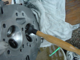 タコ棒をバルブに吸盤のように吸い付かせて、当たる瞬間に回す要領で摺り合わせしてみました。下の写真は吸気側の直径の大きい方で、こちらは吸いつくものの、排気側の小さい直径のものではうまく吸い付いてくれませんでした。仕方ないので、バルブを手で回して摺り合わせしました。結構疲れるので、バルブシートの接触面が光った程度でやめてしまいました。