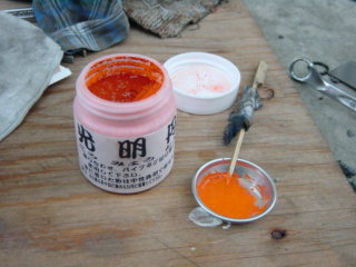バルブコンパウンドの接触跡でバルブシートの当たり面の幅がほぼ1mmでOKと確認できていましたが、実は光明丹を購入してあったので、光明丹でチェックしてみることにしました。プラモデルの塗料皿に少し粉末を入れ、エンジンオイルで溶いていきますが、どれくらいの粘度でいいのか皆目見当が付きません。
