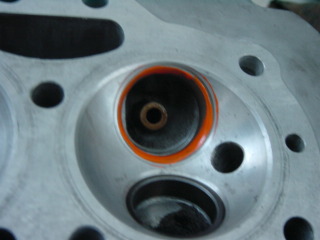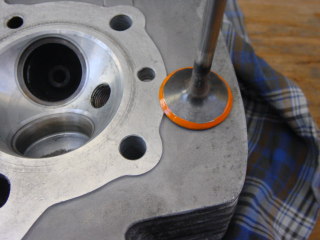 バルブシートの当たり面付近の手で塗りつけます。ここにバルブを挿入し、そっと接触させてみました。しかしうまく判りません。今SM−3を読んでみると、「バルブのフェース部に塗り、バルブシートに押しつけながら回転させ、点検する」と書いてありました。つまり間違った方法で点検したことになります。