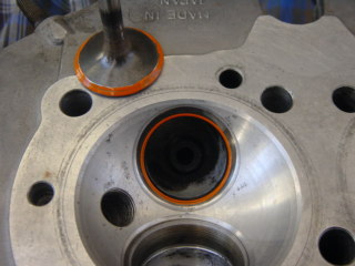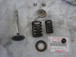 組み付ける部品は下の写真の通りで、左がバルブ、右上からスプリットカラー、バルブスプリングリテーナー、アウター・インナーバルブスプリング、スプリングシート、オイルシールです。オイルシールは純正部品の補給があったので、4個購入済みでした。