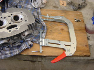 いちおうバルブの摺り合わせはできた(?)ということで、バルブの組み付けを開始します。先日バルブ部を外す際に、「プラグレンチでどつく」方法をみた方から、バルブコンプレッサを提供いただきました。いろいろなタイプがあるようですが、提供いただいたのは下の写真のタイプです。これは圧縮する量を事前にボルト部で調整しておき、赤いハンドルで一気に圧縮するタイプのようです。