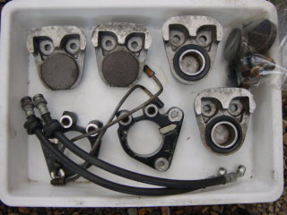 まずはフロントブレーキキャリパーをばらすことにしました。ここは以前も分解し、ピストンなどはチェック済みのため、今回は外観の塗装とシャフトの摺動の修正が主な目的です。