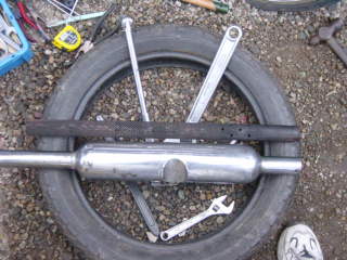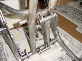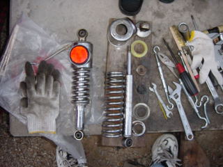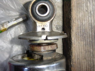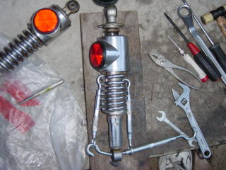 残るメッキ部品はリアショックアブソーバーだけになりました。これは分解しないとメッキに出せません。上にあるノックピンを抜き、スプリングを圧縮して内部のダブルナットを取り外せば分解できることは判っているのですが、スプリングを圧縮するための工具を自作する必要があり、適当な材料が見つかりません。何とか早く対応策を検討しないと、年内にメッキに出せません。