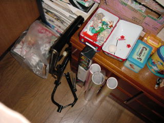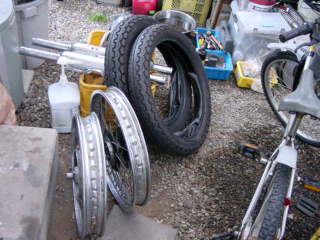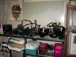 なぜかスイングアーム、センター・サイドスタンドが古新聞置き場に置かれています。