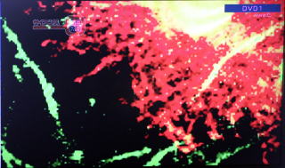 最新の顕微鏡を使って観察。緑色のものが神経細胞、赤く見えるものがグリア細胞。グリア細胞は、神経細胞に向けて沢山の腕を伸ばしている。このグリア細胞が神経細胞の突起と絡み合っているところが多く発見された。 |