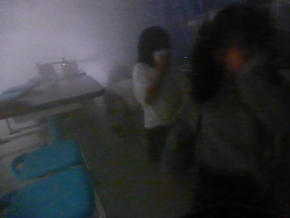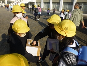 | 11月7日(火)3年生が消防署出張出前授業を受けていました。理科室を煙いっぱいにして、真白い暗い中を壁をさわりながら歩く体験をしました。「本当の火事の時はもっと黒くて有毒なガスが出る」と消防士からお話を聞き、火に気をつけようと気持ちを引き締めていました。 |