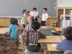 夏休みも終わり、学校に子供の声が戻ってきました。朝の夏休み後集会では、学年代表の子供が9月からの目標を発表したり、士別市派遣の報告を行ったりしました。学級に戻ってからは久しぶりに会う友達と笑顔で活動しました。 |