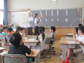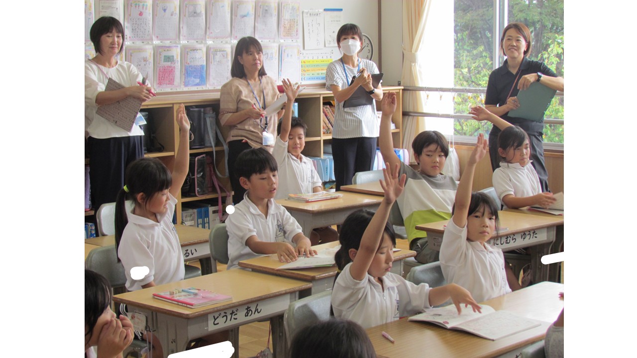 (左)1年生国語です。「おおきなかぶ」で何度も出てくる「うんとこしょ どっこいしょ」をどのように読むとよいのかみんなで考え合いました。