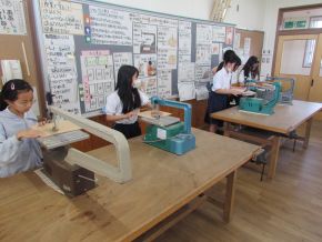 (右)5年生家庭科の様子です。先生の話をしっかりと聞き、集中して縫っていました。 |