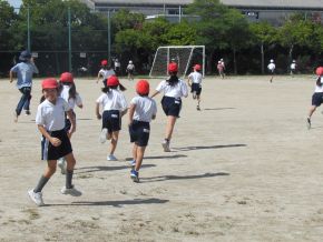 (右)3年生体育です。これまで熱中症指数が高くてなかなか外での体育ができませんでしたが、気温も落ち着き外で体育を行いました。元気におもいっきり運動場を走り回っています。 |