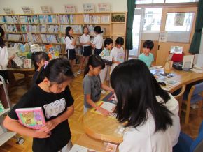 (右)今、図書委員会による「読書ビンゴキャンペーン」を行っています。放課はたくさんの三吉っ子が本を借りにきます。 |