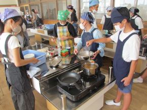 (左)6年生家庭科、調理実習です。ウインナー、にんじん、もやし、厚揚げ豆腐の炒め物でした。グループで協力して、手際よくつくることができました。