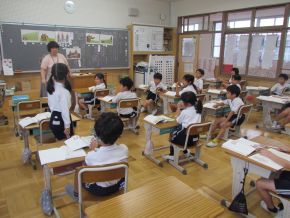 (右)5時間目に2年3組で研究授業を行いました。国語科の「ビーバーの大工事」でしたが、子供は自分の考えを積極的に発言して、とても活気のある授業でした。2年3組のみなさん、とてもすばらしかったですよ! |