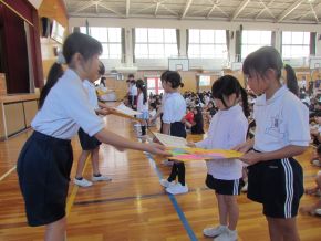 (左)朝、おはよう集会を行いました。児童会が企画した「ありがとうキャンペーン」についての表彰を行いました。