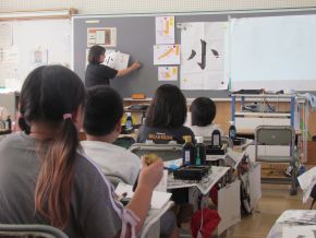 (右)3年生図工です。生き物をテーマとした版画を手がけています。さまざまな見本を元に、丁寧に動物をかたどっていました。できあがりが楽しみです。 |