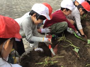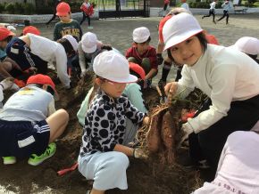 2年生が芋ほりをしました。土を掘り起こすと、大きなサツマイモがどんどんと出てきて子供たちは大喜びでした。当日、地域の方にもサポートしていただきました。学校と地域とで一緒に子供を育てていく機会が増えてきて、本当にありがたいことです。 |