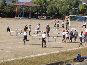(左)5年生の体育です。ハードル走に取り組んでいます。体育の授業アドバイザーの先生からコツを教えていただき、がんばっています。