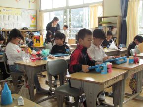 (右)2年生図工です。「ふたりはなかよし」というタイトルで紙コップに似た形の物を自分のアイデアをもとに飾りつけをしていきます。「夢の作品展」が楽しみです。 |