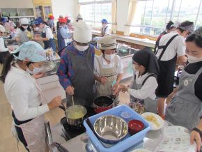 (右)5年生家庭科です。みそ汁とご飯の調理実習です。みそ汁はニボシから出汁を取りました。 |