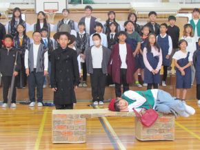 (左)6年生の様子です。体育館を使っての学芸会練習です。場面ごとのグループに集まって練習をしました。