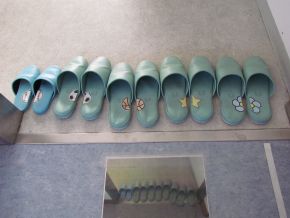 (右)6年生は「三吉小をよりよくしよう!」というテーマでプロジェクトを進めています。その中の一つで、トイレのスリッパをみんなが意識して整とんできるように、「絵合わせ」を考えてくれました。すべてのトイレのスリッパに絵が貼られていて、左右の絵を合わせることで必然的にスリッパの整とんができています。とてもすばらしい発想で驚きました。6年生のみなさんありがとう! |