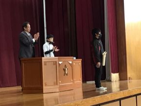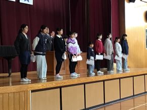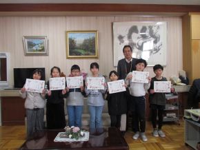 (左)「税に関する作品募集」において賞を得た三吉っ子が、税務署の方から直接表彰していただきました。おめでとうございます。