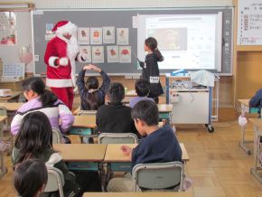 (左)「サンタが三吉小にやってきた!」今日はサンタクロースと一緒に英語に親しみました。