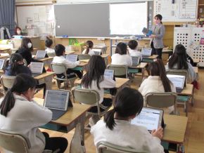 (左)4年生の様子です。ICT支援員の方から、はじめに情報モラルについて学びました。「グループLINEの適切な使い方」「メッセージを発信するときに気をつけたいこと」など、トラブルにならないために気をつけたいですね。