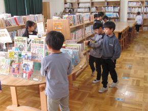 (右)冬休みに向けての図書の貸し出しを行っています。冬休み中は自分の時間がとれますので、読書や自分の趣味など、有意義に過ごしてほしいと思います。 |