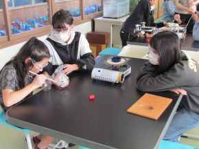 (左)5年生理科です。ミョウバンについて実験をとおして学習しました。安全確保のためにきちんとゴーグルをつけています。 |