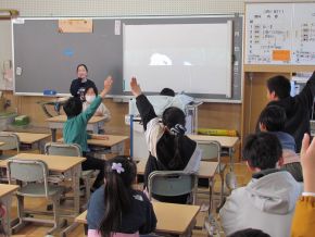 (右)4年生総合の時間です。さまざまな職種の方をお迎えし、16のブースに分かれてお話を聞きました。やりがいや苦労などを聞くことができ、自分の夢について、考えるきっかけとなりました。今回、コミュニティスクールの関係で、地域コーディネータの方をとおして講師をお願いすることができ、大変感謝しています。 |