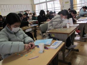 (右)明日は今年度最後の授業参観日です。多くの保護者の方にお子さんの活躍を見てほしいと思っています。同時に、書初め大会で書いた子どもの作品を掲示します。こちらもぜひ御覧ください。 |