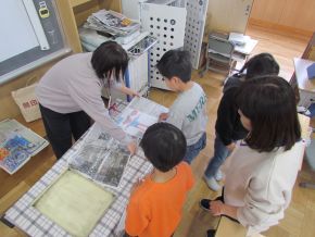 (右)2年生図工です。紙版画に取り組みました。紙を慎重に扱い、版画をしています。 |