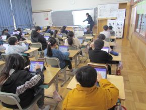 (右)4年生の様子です。ICT支援の方に来ていただき、プログラミングの学習をしました。画面上でキャラクターを考えたとおりに動かすプログラミングを作成しました。どうやったらよいのか、私にはついていけませんでした。子供の吸収力はすばらしいです。 |