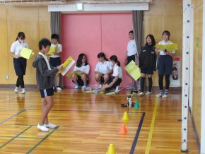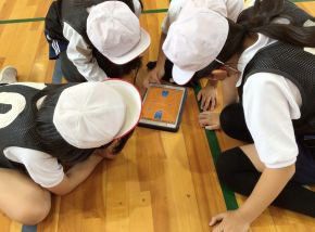(左)5年生体育です。バスケットボールをやっていますが、チームでの作戦をみんなで一緒に考え合っています。