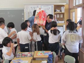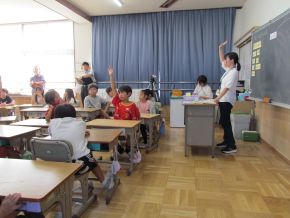 (左)総合的な学習の時間の一環として、なかよしタイムに4年生が3年生の教室に行き、ペットボトルを使った「パクパク」というおもちゃの作り方を説明しました。
