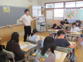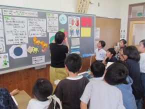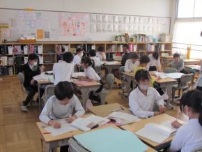 (右)4年1組で国語科の研究授業を行いました。「くらしの中の和と洋」において、洋室の良さを要約して説明することを友達と考え合いました。 |