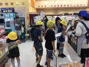 (右)3年生はスーパーマーケットに校外学習に行きました。お店の方にもいろいろと取材をさせていただき、「スーパーマーケットのひみつ」をたくさん知ることができました。 |