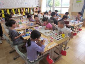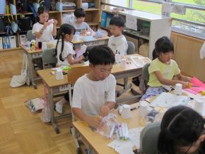 (右)2年生図工です。「ふたりはなかよし」というタイトルで紙コップに似た形の物を自分のアイデアをもとに飾りつけをしていきます。「夢の作品展」が楽しみです。 |