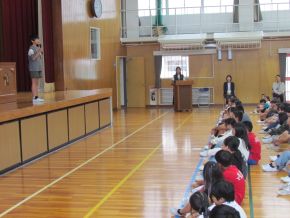 (左)今日から後期がスタートしました。後期始業式で、代表児童が後期にがんばりたいことを堂々と発表することができました。