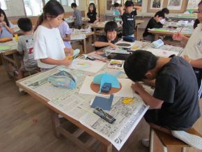 (右)3年生図工です。わりピンを使って、一部のパーツが動く作品を作っていきます。どんなデザインにしようか子供は一生懸命に考えていました。 |