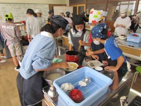 (右)5年生家庭科です。みそ汁とご飯の調理実習です。みそ汁はニボシから出汁を取りました。 |