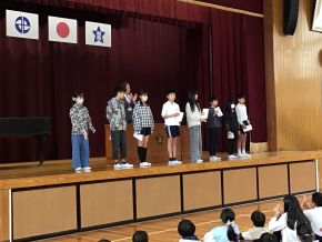 (左)おはよう集会で児童会役員、各委員会委員長・副委員長、学級委員の任命を行いました。みんなが新しい係となり、新鮮な気持ちで係活動をがんばっています。