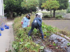 (左)明日の2年生芋ほりに向けて、地域コーディネーターや学校運営協議会委員などの方に御協力いただき、芋のツルを切ったりシートを外したりする活動を助けていただきました。コミュニティスクールの推進活動として、大変感謝しています。