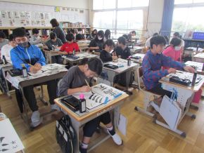 (左)6年生書写です。今年度の書き初めの言葉は「満点の星」です。みんな一生懸命に練習しました。