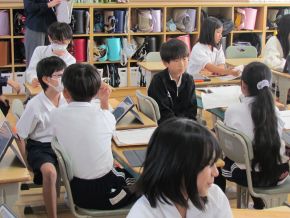 (右)5年1組で国語科の研究授業を行いました。「和の文化を受けつぐ -和菓子をさぐる」において、自分の考えをもとに、友達とたくさん意見を交わし合いました。 |